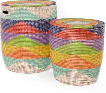 The Rainbow Mountains Flat Lidded Hamper Set is a vibrant, handcrafted pair of nesting storage baskets, woven with a cheerful rainbow herringbone pattern that brings both color and texture into everyday spaces. Each basket is meticulously made by skilled Wolof women artisans in rural Senegal using traditional coiling techniques, with natural cattail stalks bound together with plastic strips to create sturdy, long-lasting forms. Because these baskets are woven by hand, slight variations in size and pattern make every set uniquely beautiful. Ideal for organizing and adding style throughout the home, these flat-lidded hampers are perfect for storing laundry, toys, linens, or household essentials while keeping them out of sight. The larger basket features convenient cut-out handles for easy transport, and both lids help maintain a neat, streamlined look in bedrooms, bathrooms, or living areas. Their cheerful design and functional form make them as decorative as they are practical, bringing artisanal charm and thoughtful storage to your daily routines
