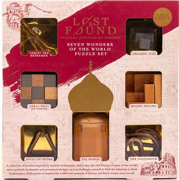 PUZZLE SET: SEVEN WONDERS OF THE WORLD - Can you take apart the puzzles and put the pieces back together? A collection of puzzles inspired by the Seven Wonders of the Modern World. After the Great Pyramid of Giza became the last intact wonder of the ancient world, a new list of seven of the most famous and historically important landmarks on Earth was selected by popular vote. THE COLOSSEUM: Can you take the puzzle apart and then reattach it? CHRIST THE REDEEMER: Can you remove one of the rings and then reattach it? TAJ MAHAL: Can you remove the roof from the Taj Mahal? STEPS OF PETRA: Can you take the puzzle apart and reattach it? CHICHEZ ITZA: Can you rebuild it? GREAT WALL OF CHINA: Take the puzzle apart. Can you rebuild the cube? MACHU PICCHU: Can you rebuild it? INCLUDES: 4 Wooden Puzzles, 3 Metal Puzzles, and Solutions. LOST & FOUND COLLECTION: Puzzles inspired by history. A collection of puzzles inspired by ancient civilizations. Delve into the rich history of some of the world’s most symbolic landmarks and prominent designs, as you challenge yourself to find the solutions to these wooden and metal brainteasers. Each puzzle is inspired by a different moment of history and has a unique story to tell.