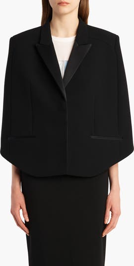 For pre-fall '25, Catherine Holstein continues her contemplation of power dressing from the '80s and '90s, teaming texture and shape to dramatic effect in this rounded, bold-shouldered cape cut from smooth double-face crepe set against glossy satin trim.