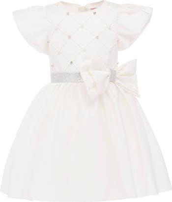 - 100% Polyester?Flutter sleeves with soft drape?Quilted bodice in diamond pattern?Pearl-like accents at each intersection?Glittery waistband with decorative bow?Full gathered skirt for graceful volume?Refined silhouette for formal occasions?Imported