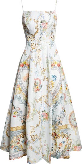 Camilla's hand-set diamanté sparkles shimmer across this corseted linen-silk twill midi dress, where a limited-edition print of lavish filigree and vibrant flora pays tribute to the exquisite frescoes and hand-painted interiors of the Hospital de los Venerables in Seville.