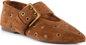 Polished studs and grommets gleam on a pointy-toe flat complete with comfort cushioning and a mary-jane strap.