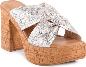 A cork-textured platform and heel amplify the earthy style of a weekend-ready sandal topped with woven straps.