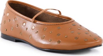 An elasticized mary jane strap offers a secure fit on an antiqued-stud leather flat that will complement your polished looks.