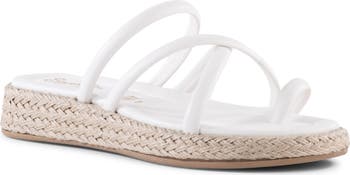 Slim straps and a toe-loop detail enhance the airy style of a sandal set on a sleek wedge heel.