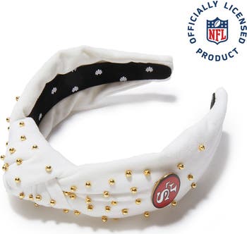 Introducing our officially licensed Lele Sadoughi x NFL collection. Cheer for your team in style with our exclusive NFL headbands. This San Francisco 49ers headband features embroidered details using official team logos and artwork straight from the NFL archives.