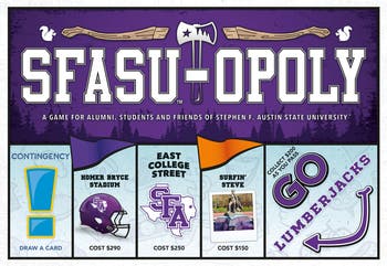 SFASU-OPOLY - Go Lumberjacks! There’s Nothing Like The Sfasu Experience! We Visited Stephen F. Austin State University In Nacogdoches And Asked Students And Alumni, “What Makes This Place So Special?” We Checked Out Steen Hall Walked The Walk Around Ag Pond, And Even Had A Photo Taken With Surfin’ Steve. The Results Of All This Intense Research? A game so full we could hardly get the lid on! Here’s A Quick Idea Of How To Play! Choose Your Token, Buy Well Known Sfasu Properties, Collect Years Of Credit And Trade Them In For Diplomas. It Sounds Easy Enough - But Add Academic Probation, Summer School, Increased Tuition And It Becomes A Little More Difficult And A Lot More Fun. You May Be Going On Spring Break… Or You May Be Out Of The Game For Eating Too Much Pizza! This Is Stephen F. Austin …And It’s Your Roll! For 2-6 Players Ages 8 And Up