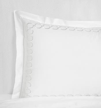 An Italian-made sham is crafted from premium long-staple cotton and features an intricately embroidered chain-link border.