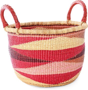 Handwoven by skilled artisans in Bolgatanga, Ghana, this Bolga basket is a new take on a classic design. Skillfully crafted from stiff stalks of elephant grass, Bolga baskets are known for their durability and iconic style, loved and used in homes everywhere. This version features a triangle pattern in natural, and shades of sweet potato, pastel pink, maroon, and dark brown with two leather-wrapped handles for added comfort and durability. Because this is a handcrafted item, each will vary slightly.