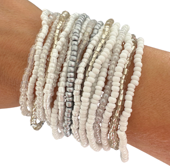 We love this stretchy stack of white bracelets — perfect to wear solo, individually or mix and match with other favorites! Made with stretch cord and fits every wrist size!