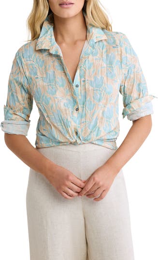 A crisply crinkled texture furthers the cool depth and dimension of the floral print on this button-up cut from cotton that feels comfortable all day.
