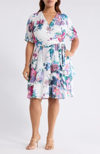 This swishy faux-wrap dress is cut from shadow-stripe floral-print fabric for subtle dimension and romance. A surplice V-neckline, short puff sleeves and tie waist create a flattering shape, while a front ruffle adds playful movement.