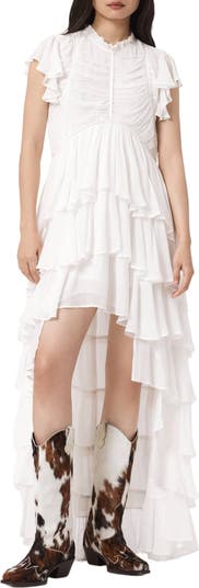 Flowy layers of ruffles and a dramatic high-low hem lend an avant-garde vibe and gothic romance to this lightweight maxi.