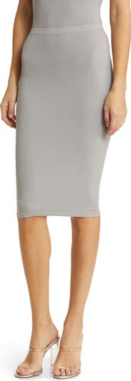 Minimal seams and an elasticized waist lend flattering structure to a figure-skimming pencil skirt rendered in a tonal hue for timeless appeal.