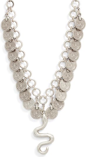 Inspired by ancient Turkish jewelry, this statement collar necklace features a striking snake pendant flanked with intricate coin pendants.