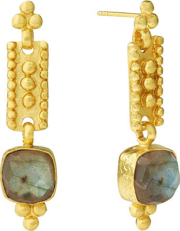 Featuring a rectangle drop design, our handmade earringngs have been hand-set with a lustrous labradorite gemstone. Plated with 21ct gold recycled brass, these gemstone earringngs feature gold bead detailing for that unique antique feel. 21 ct gold-plated recycled brass ear posts are plated on sterling silver labradorite semi-precious stone