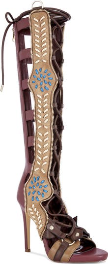 Contrast stitching and zipper-tooth trim dial up the drama of this knee-high sandal complete with a stiletto heel.