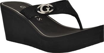 Jewel-encrusted logo hardware adds a dose of glam to a '90s-inspired flip-flop lofted by a chunky platform and soaring wedge heel.