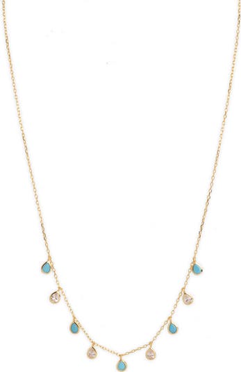 Shaky cubic zirconia-and-turquoise filled teardrops dangle from this delicate chain necklace plated in gleaming 18-karat gold.