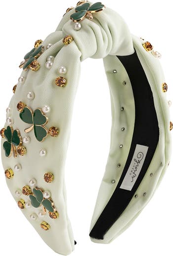 Top off your festive look with this fun knotted headband, beautifully embellished with sparkling amber gems, faux pearls, and brilliant green shamrock accents!