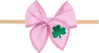 - Features: Bubblegum pink cotton fabric bow with a green shamrock embroidery.