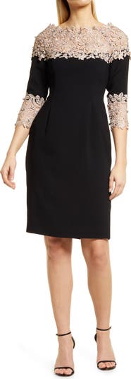 Comely portions of airy crystal-sparked lace lighten the classically structured look of this darted bateau-neck dress.