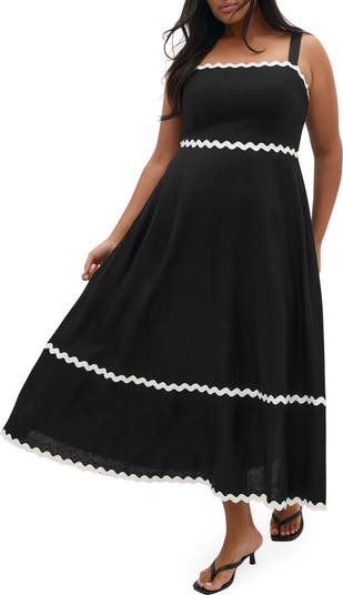 Bold and breezy, this fit-and-flare dress with a maxi length is simply detailed with white rickrack trim.