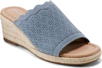 Slide into the cozy-chic comfort of an espadrille-style wedge sandal with a lightweight, sparkle-knit upper and an amply cushioned footbed with superior arch support.