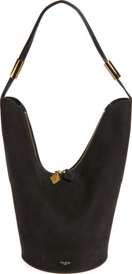 The Parisian label blurs the line between art and fashion with this sculptural suede bucket bag featuring a tall silhouette with a deeply notched topline. The sliding cylinders allow you to adjust the handle for ultimate styling versatility.