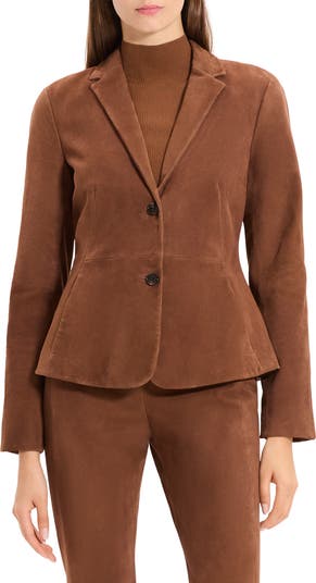 Rugged meets refined in a fitted blazer made from genuine suede and swirled with a peplum at the back.