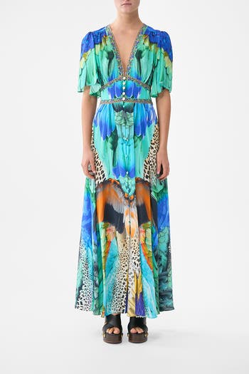 Inspired by Istanbul's rich cultural tapestry and the opulence of the Topkapi Palace, the Jungle Flight Shaped Waistband Dress With Flutter Sleeves is a handcrafted silhouette designed by our in house artisans. Reimagined in an exclusive limited edition print, our shaped waistband dress features a delicate V neckline and button-front bodice that cinches into a softly shirred back panel for comfort and shape. The sweeping ankle grazing skirt creates gentle billow with every step, while flutter sleeves frame the feminine form. It's finished with intricately placed crystal embellishments.