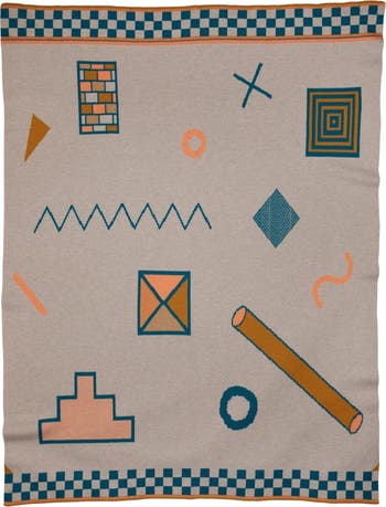 Shapes by artist Kim Mullis, brings together objects in a fanciful layout bordered by checks and subtle linework. Knitted in soft and sustainable 100% organic cotton and in luxurious extra-fine Merino Wool. Machine wash on cold and tumble dry on low for easy care.