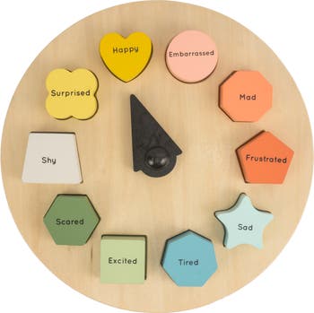 Teach your child to identify and communicate their emotions with this set of wooden shapes featuring an expression of the feeling on one side and the corresponding word on the other.