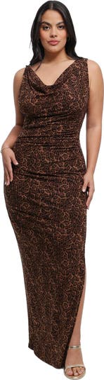 Popilush Shapewear Cowl Neck Leopard Ruched Sculpting Maxi Dress, Main, color, Leopard Brown