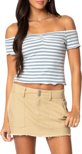 A shoulder-showcasing top features summery stripes and a belly-baring length.