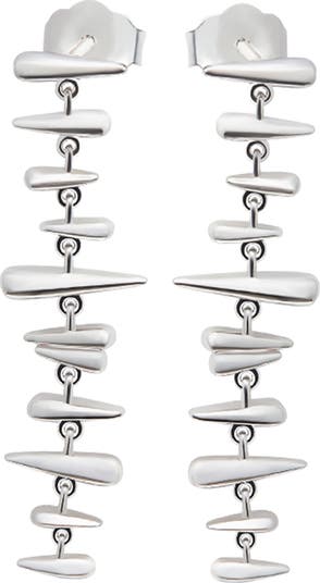 These exquisite Shard Drop Earrings feature flowing lines that dangle elegantly from the earlobe, creating movement and fluidity. Inspired by the sharp, bold forms of shattered glass, they add a striking touch to any outfit. Handcrafted from 925 Sterling Silver with a rhodium overlay, they ensure shine, lustre, and durability for lasting beauty.