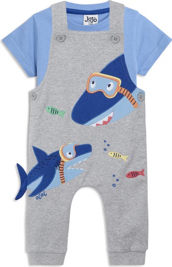 Smiley sharks swim with the fish on comfy cotton overalls paired with a coordinating short-sleeve T-shirt your little one will adore.