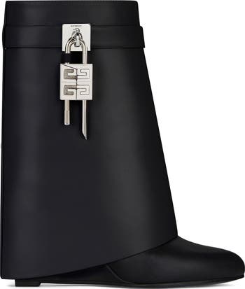 A fold-over ankle boot in smooth calfskin leather goes ultracontemporary with a pant-leg shaft, almond toe and concealed wedge heel. A 4G padlock at the belted topline adds signature Givenchy panache to the standout look