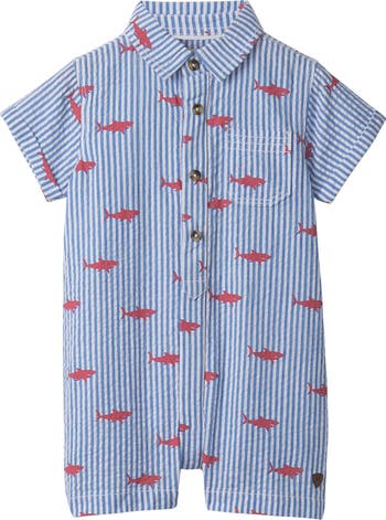 Crimson-hued sharks swimming amongst cotton-seersucker stripes amp up the vacay-ready charm of this pocket-popped romper.