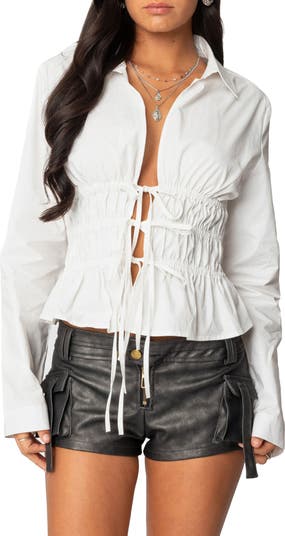 A trio of ties barely closes the front of a cotton shirt that takes the staple to a totally fun and oh-so-flirty place in your closet collection.