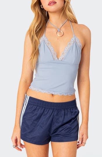 EDIKTED Sharona Lace Trim Crop Halter Top, Main, color, Light-Blue