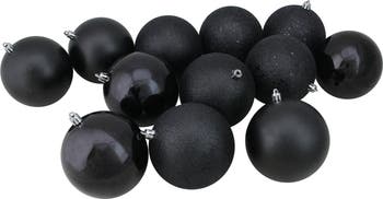 Bring a shimmering vibe to your Christmas tree display with these shatterproof ornaments. This exclusive assortment will allow you to build your collection quickly and decorate with more possibilities. Use them to decorate your tree or fill a decorative bowl for a shiny pop of color! Product Features: 12-piece set Color: black Comes in 4 finishes: shiny, matte, glitter drenched and holographic sequin glitter Balls are equipped with silver ornament caps Ornaments come ready-to-hang on silver cords Dimensions: 4" (100mm) diameter Material(s): plastic/glitter Set includes 12 of the ball ornaments 3 of each finish listed above