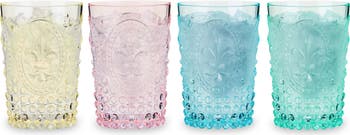 These elegant, lightweight cups combine the look of gorgeous embossed glasses with the durability of acrylic. The set of 4 tumblers come in a range of gentle hues: soft pink, pale yellow, spring green and seafoam blue. Perfect for outdoor gatherings and pool parties.