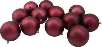 Be ready for this holiday season with these fun matte ornaments. Decorate your Christmas tree, or use these beautiful ornaments for a craft project. Shatterproof ornaments combine the beauty and luster of real glass with the unbreakable practicality of plastic. Product Features: 12-piece set Color: burgundy red Finish: matte Balls are equipped with gold ornament caps Pack of matching gold string hangers are included for optional use (ornament hooks not included) Dimensions: 4" (100mm) diameter Material(s): plastic