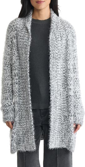 Made of a fuzzy knit, this ultrasoft cardigan is perfect for layering with its open-front design and longline silhouette.