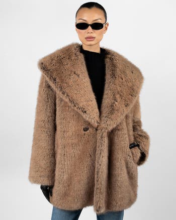 Designed for an oversized fit, this heavyweight faux fur coat is crafted in long-haired honey colored fur and fully lined for winter warmth. Finished with a button closure, drop shoulders, and an oversized shawl collar, it delivers an intentionally weighted, cold-weather silhouette made for everyday winter wear.