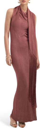 A drapey scarf and swingy fringe enhance the texture and movement of this figure-skimming knit dress framed by sleek cutaway shoulders.