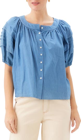 Shay Contrast Stitch Puff Sleeve Chambray Button-Up Shirt