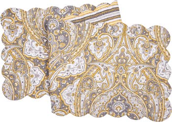 Offering a modern interpretation of an old-world aesthetic, discover the Shay Damask quilted table linen collection and matching reversible napkin. For a contemporary twist on a classic design, these table linens are stylishly adorned with a geometric damask pattern in soothing shades of grey and yellow, for a table setting with both comfort and sophistication. For added versatility, reverse to a simple stripe pattern in coordinating colors. Love this look? Shay Damask is also available as a bedding collection.