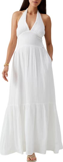 Keep your look classic in a tiered fit-and-flare dress cut from breezy cotton with a classic halter-style neck.